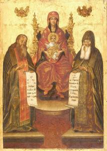 Orosz festő Trónoló Istenszülő Szt. Feodoszij és Szt. Antonyij szerzetesekkel