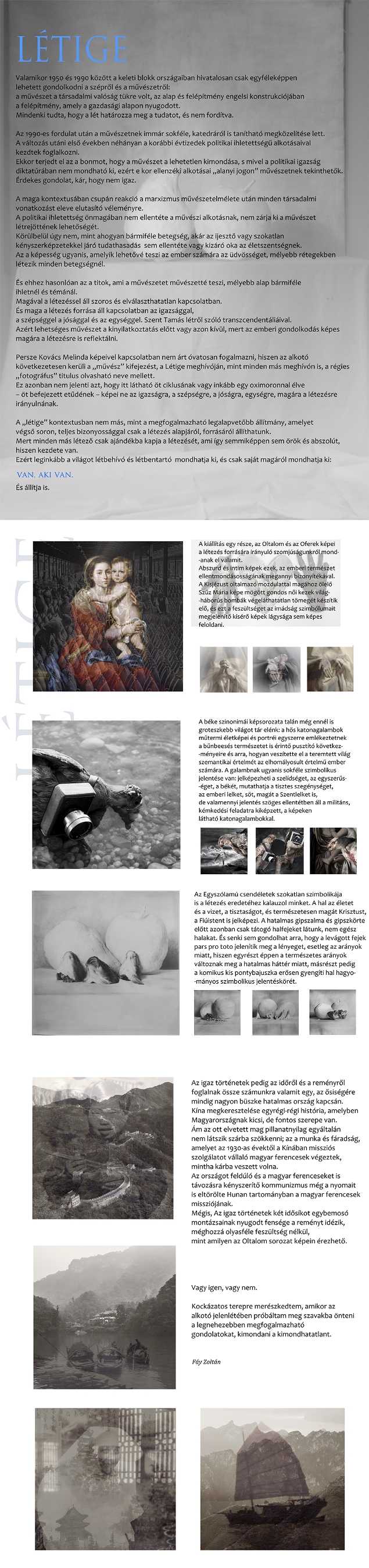A tárlaton szereplő sorozatok -az Oltalom, mely a Szűzanya tiszteletéhez kapcsolódik, az Igaz történetek, aminek alapja a Kínában missziós tevékenységet folytatott ferences szerzetesek fényképei, a Béke szinonimái, amely a galamb ikonográfiájáról beszél, és az Egyszólamú csendélet sorozat szimbolikus tárgyaival- értelme, jelentése azonos. „Van, aki van” „ehje aser ehje” Kiv.3.14.