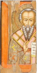Az erősen sérült ikonon Szent Miklós püspök hagyományos módon, szemből, félalakban jelenik meg. Jobbját áldó gesztussal emeli fel, mára elpusztult másik keze egykor a nyitott könyvet tartotta. Nyakában keresztes stólát visel. Fejétől balra kicsiny Krisztus-fej ábrázolás látható. A kép ukrán - esetleg ukrán hatás alatt dolgozó szerb - festő alkotása. Hátoldalán szerb nyelvű felirat olvasható.