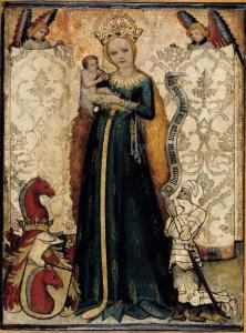A címere alapján személyében is azonosítható salzburgi Bernhard Praun lovag Mária közbenjárását kéri a képen. Mondatszalagjának latin nyelvű felirata magyarul így szól: „Ó Szent Szűz Mária, imádkozz értettünk, imádkozz!” Mária alakjában a szokásos ábrázolások ismert elemeinek sajátos vegyítését figyelhetjük meg. Termékenységére és szeplőtelen fogantatására utal a kalászos köpönyeg, s ehhez mennyek királynőjeként koronát visel és karján tartja Isteni gyermekét. Jézus az eredeti, Ádám és Éva által elkövetett bűntől való megváltást jelképező almát tartja kezében. A bűn elutasítását szemlélteti a lovag térde alá szorított és kardjával leszúrt sárkányalak, azaz maga a sátán. A kép megfestését annak a mesternek tulajdonítják, aki a salzburgi Museum Carolino Augusteumban őrzött halleini oltárt is festette 1440 körül.