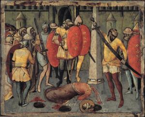 A kis tábla Szent Pál életét bemutató predella utolsó darabja volt; a képsorban a megelőző jelenetek Pál megtérését, prédikációját, valamint vesztőhelyre vezetését ábrázolták. Az apostolszent mártírhalálát antik római környezetnek szánt díszletek és szereplők közé helyezte a festő: a katonák a kivégzés hagyomány szerinti színhelyének közelében, a római ostiai kapu (ma Porta S. Paolo) előtti piramis mellett álldogálnak dolguk végeztével. A kép egy ritkán ábrázolt legenda-részletet is tartalmaz, mely szerint a szent lehulló feje többször visszapattant a földről és mindannyiszor Jézus nevét kiáltotta („GESÙ”). A mélyedésekből forrás tört föl: a csoda emlékére e helyen alapították később a jelentős zarándokhelyet, a Három Forrásnak szentel apátságot (Abbazia delle Tre Fontane). A mű Luca di Tommè késői munkái közé tartozik: erős kontúrok, sötét modellálás, expresszív fények jellemzik. A vázlatos kivitelezés műhelysegédek közreműködésére utalhat. A sorozat Boskovits Miklós szerint talán ahhoz az elveszett Szent Pál oltárhoz tartozott, amelyet a sienai köztársaság rendelt meg egy 1363-as győztes csata emlékére, s amellyel kapcsolatban a festő 1374-ben még kapott kifizetést.