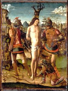 Legenda Aurea elbeszélése szerint keresztény hite miatt addig lőttek nyilakat Diocletianus katonái, míg „olyan lett, mint egy sündisznó”. A halottnak hitt szentet magára hagyták, ő azonban csodálatos módon felépült sebeiből. A képen az a ritkán ábrázolt pillanat látható, amikor a nyilazás előtt a pribékek egy csonkolt fatörzshöz kötözik a szentet. Sebestyén nyugodt, szelíd arcát a festő szándékosan állította szembe a katonák brutális arckifejezésével. A kisméretű képet, melyet heterogén elemekből táplálkozó stílusa miatt nehéz megnyugtatóan