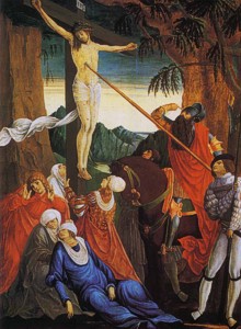 előképnek. A részletek kidolgozása itt elnagyoltabb, az alakok karcsúbbak, lágyabban íveltek, a rajzolat kevésbé kemény, kontúros. A képen jól megfigyelhetők az ausztriai és a bajor Duna vidékének 1490-1540 közötti festészetét meghatározó úgynevezett Dunai iskola bizonyos korai jellegzetességei, mint az élénk színek, a finom fényfoltok, az átlós és a vertikális kompozícionális séma vegyítése. A későbbi önálló tájképfestészet műfaját a bibliai jelenetek egyre valósabbnak tetsző tájba illesztése indította el. A háttér messzi, kopár, zöldeskék sziklái a távolságot érzékeltetik. A középtér ősi fatörzsei a jelenet közvetlen terét határolják le. A keresztfa egyrészt az égbe nyúlik, de a fölébe hajló dús lombok a földközeliségét is kifejezik. A kereszt kikerült a középkorban szokásos középtengelyből és